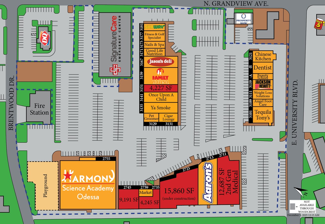 Town & Country Shopping is an approximately 148,000-square-foot shopping center located at the northwest corner of University and Grandview in Odessa, Texas. Town & Country is anchored by Aaron’s, Jason’s Deli, Family Dollar, and Golf & Fitness Specialists. Commercial suites at this center are available to rent for anything from traditional retail storefronts and restaurants to offices and medical or other professional service providers. Suite 2711 is a 2nd generation medical office endcap with 12,687 square feet available. Suite 2723 is being rebuilt from the ground up, and is very flexible in suite size and configuration. The highly generative area is ideal for any business and continuously expanding as the sturdy 2.2% population growth rate from 2010 to 2022 within a five-mile radius is projected to jump to 3% through 2027. One of the largest economic anchors for Odessa is The University of Texas Permian Basin, which is about a mile from Town & Country. Odessa College is two miles away, with combined enrollment counts of over 11,000 students. Woodcrest Capital welcomes first-time and franchise businesses to its centers with easy-to-read leases and flexible terms while being sufficiently sophisticated to please the largest national credit tenants. As a family-owned business with over 40 years in commercial real estate, Woodcrest owns and operates everything from Class A centers in the busiest neighborhoods to troubled centers it’s rehabilitating in struggling rural communities. Call us today to find the right location for your business, as we usually have multiple retail opportunities in the immediate area!
